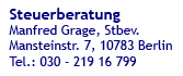 Da muß ich meinen Steuerberater fragen Sie haben als Steuerpflichtiger Fragen? Wir haben die Antworten. Sie suchen kompetente Steuerberatung in allen steuerlichen Angelegenheiten? Sie wissen nicht, ob Sie als Rentner eine Steuererklärung abgeben müssen? Sie planen eine Existenzgründung und benötigen einen Businessplan? Sie suchen Beratung bei bei Ihren Investitionsentscheidungen? Sie haben Fragen zur Erbschaftssteuer? Dann sind Sie hier richtig. Wir beraten Sie persönlich, kompetent und preiswert in allen Steuerfragen, Plänen zur Existenzgründung und Vermögensverwaltung. Steuerberater sind viel günstiger als Sie denken, ab 75 Euro kommen wir in Berlin auch zu Ihnen und erledigen an Ort und Stelle Ihre Steuererklärung. Am besten sprechen Sie noch heute mit uns! Steuerbüro Manfred Grage, Stbev. Mansteinstr. 7, 10783 Berlin-Schöneberg Vereinbaren Sie unter 030 - 219 16 799 einen Termin. Bürozeiten Mein Büro ist Montag bis Freitag von 9:00 bis 18:00 Uhr durchgehend geöffnet. Ich bin in diesen Zeiten durchgehend telefonisch erreichbar und stehe Ihnen nach Terminvereinbarung gerne für alle Auskünfte zur Verfügung. In eiligen Fällen können wir kurzfristig einen Termin vereinbaren.Termine außerhalb der Bürozeiten sind möglich. Wir kommen auch zu Ihnen und erledigen Ihre Steuererklärung sofort preisgünstig an Ort und Stelle. Steuerberatung Berlin, Steuerberater Berlin, Steuerkanzlei Berlin, Steuerbüro Berlin, Grage, Steuerberatung-Grage, Grage Berlin, Manfred Grage Steuerberater Schöneberg, Steuerberater Friedenau, Steuerberater Steglitz, Steuerberater Lankwitz, Kooperation mit Rechtsanwalt Wolfgang Kophal in Lankwitz, Steuerberater Tempelhof, Steuerberater Kreuzberg, Steuerberater Mitte, Steuerberater Neukölln, Steuerberater Friedrichshain, Steuerberater Wilmersdorf, Steuerberater Charlottenburg, Steuerberater Spandau, Steuerberater Köpenick, Steuerberater Zehlendorf, Steuerberater Pankow, Steuerberater Berlin-Pankow, Steuerberater Lichtenberg, Steuerberater Marzahn, Steuerberater Hellersdorf, Steuerberatung Schöneberg, Steuerberater Treptow, Berlin, Künstler und Freiberufler, eCommerce, Handwerker, Gastronomie, Schöneberg, Berlin-Schöneberg, Berlin Schöneberg, Einkommenssteuer, Einkommensteuer, Steuererklärung Berlin, Einkommenssteuererklärung Berlin, Einkommensteuererklärung Berlin, Lohnsteuer, Lohnsteuertabelle, Gewerbesteuer, Freiberufler, Steuertipps, Steuertricks, Scheinselbständigkeit, Finanzbuchhaltung, Erbschaftssteuer, Schenkungssteuer, Immobiliensteuerrecht, Gründungszuschuss, Einstiegsgeld, Eigenheimzulage, Jahresabschlusss Berlin, Bilanz, Überschussrechnung Berlin, Ansparabschreibung, Sonderabschreibungen und Immobilienbewertung das sind die indizierten Begriffe für meine Seiten, damit Sie mich auch finden. |